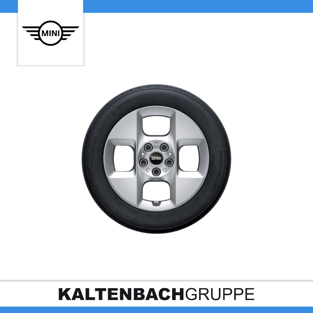 Das hochwertige 16'' MINI 4-Square Spoke 955 in Refined Silver verleiht dem Fahrzeug mit seiner markanten Optik eine besonders sportliche Note. Schneekettentaugliches RDC-Winter-Komplettrad, mit Reifengröße 195/55R16 91 H XL MINI Leichtmetallfelgen fügen sich nicht nur optisch perfekt in das Fahrzeugdesign ein, sondern erfüllen dabei gleichzeitig höchste Qualitätsanforderungen. Neben optimaler Langlebigkeit überzeugen sie vor allem durch absolute Rundlaufgenauigkeit. Um diese außerordentliche Qualität langfristig gewährleisten zu können, werden die Räder gemäß den hohen BMW Absicherungsstandards umfangreichen Prüf- und Testverfahren unterzogen.
